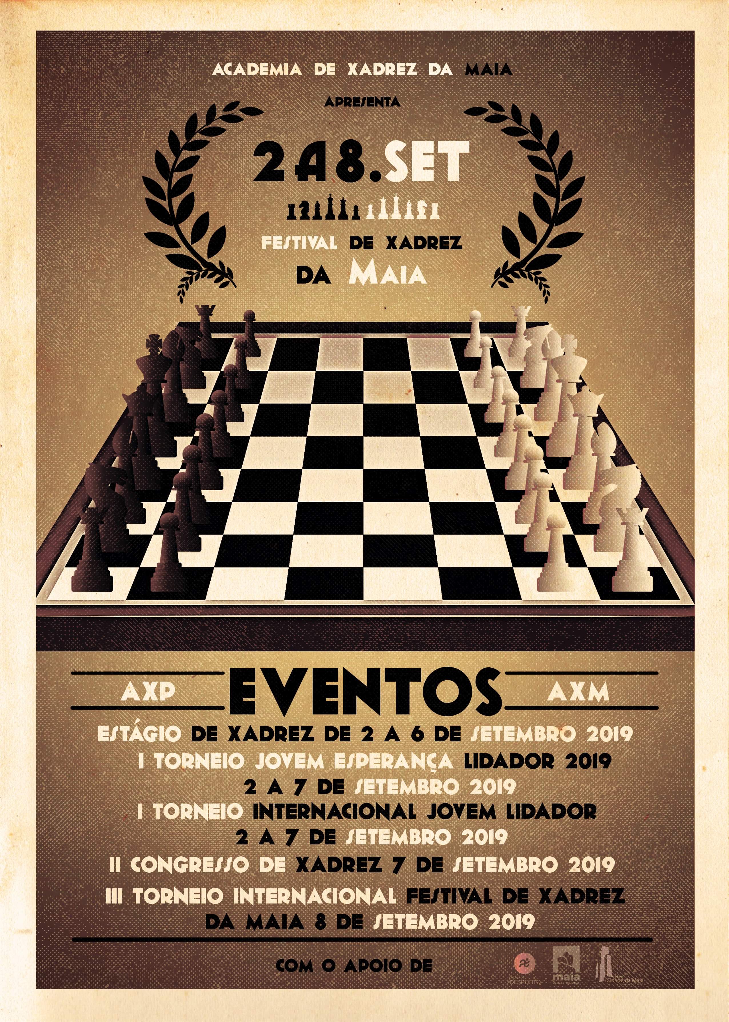 O Festival de Xadrez da Maia decorre entre os dias 02 e 08 de setembro de 2019 na cidade da Maia, o festival engloba diversos eventos xadrezistiscos ao longo de 7 dias que prometem animar a cidade.