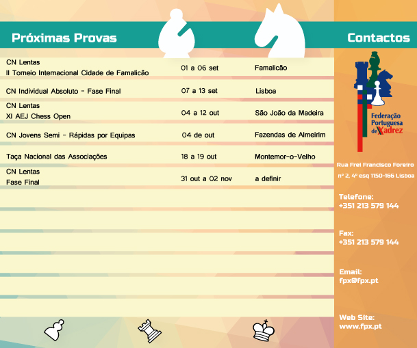 De 1 a 14 de agosto decorreu em Tromso na Noruega as Olimpíadas de Xadrez de 2014. Portugal esteve representado na competição pela seleção absoluta e feminina alcançando o 58º lugar em 179 na seleção absoluta e 75º lugar em 139 na seleção feminina, conquistando 2 terceiros lugares de categoria.