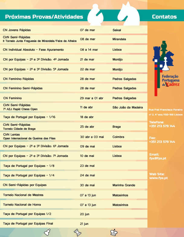 Foi no dia 7 fevereiro que a Escola Secundária Padre António Vieira com o apoio do Estrelas S. João de Brito e da Junta de Freguesia de Alvalade recebeu a 3ª edição do Campeonato Nacional de Jovens de Partidas Semi-Rápidas por Equipas, nos escalões Sub-08 a Sub-12 e Sub-14 a Sub-20. CXAE Filipa de Lencastre que revalidou o título de campeã nacional no escalão de Sub-08 a Sub-12 e nos Sub-14 a Sub-20 foi CX A2D - Didáxis a levar o título para o norte de Portugal.